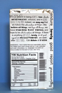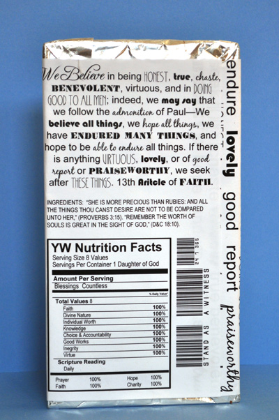 In addition to the text of the Thirteenth Article of Faith, the back of the wrapper features an ingredients list with scriptures about the worth of a young woman.  The YW Nutrition Facts is full of Personal Progress values and the bar code says “Stand as a Witness 24 7 365.”