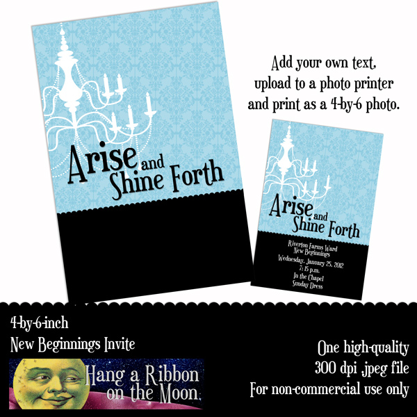 Even though it is the middle of November, we’re planning our New Beginnings evening for the young women in our ward now because January will be here before we know it.  And this year, we’re using the 2012 Mutual theme, Arise and Shine Forth, as our inspiration. We plan on using a chandelier theme as I explained in this previous post and I’ve used my 2012 Mutual theme logos to create an elegant New Beginnings invitation, which I am providing for you to download.
