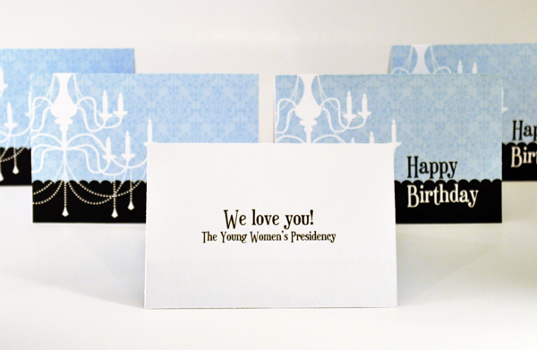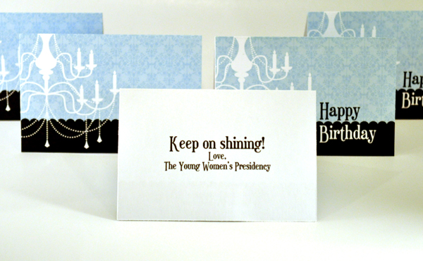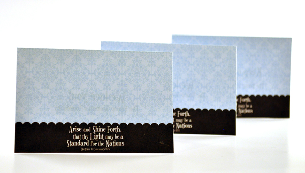 The cards measure 3 3/4-by-2 1/2-inches when folded and have the chandelier logo on the front and the full 2012 Mutual theme scripture on the back. My .pdf file lets you print four cards per page.