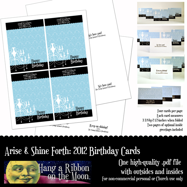 To help the Young Women in our ward celebrate their birthdays this year, we’re giving them a handmade bracelet designed to fit with the Arise and Shine Forth Mutual theme. Each bracelet will be presented to the girls in a small gift bag with a custom-designed birthday card slipped inside. Our YW president asked me to make the cards using my 2012 Mutual theme logos and I thought I would share them with you.