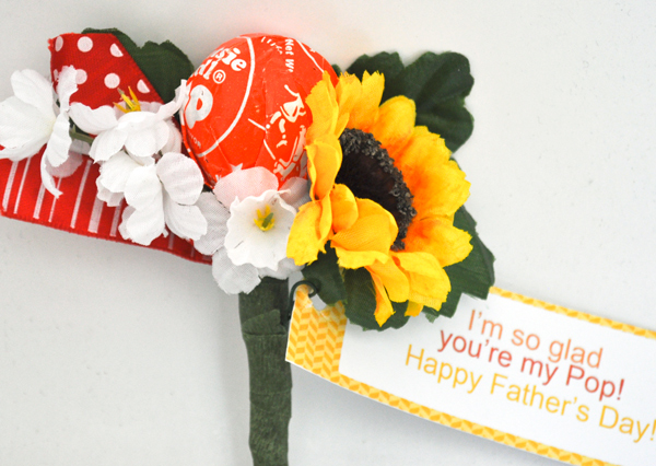 1. Gather three sprigs of flowers, a Tootsie Pop, a three- to four-inch piece of ribbon and an “I’m so glad you’re my pop!” tag.