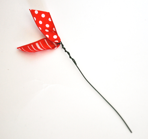 3. Fold ribbon in half lengthwise and attach to one piece of florists wire.