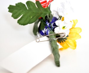 8. Using a hot glue gun, glue one side of a  safety pin to the back of the boutonniere, leaving the opening part free so it can be used to pin the boutonniere to a lapel.