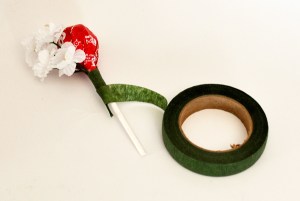 5. While holding the Tootsie Pop and one sprig of flowers together, wind the florists tape (stretching slightly as you go) around both the Tootsie Pop stick and stem of the flower sprig to hold them together.