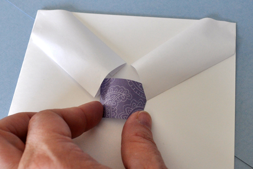 14. Gently arch tie and slip it up and under the already glued knot. Press down gently on edges to adhere. If necessary, slip a bamboo skewer or pair of scissors inside to press down on tabs.
