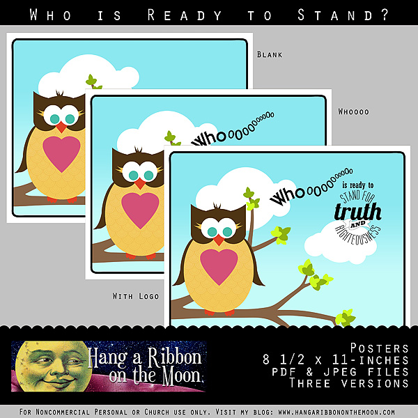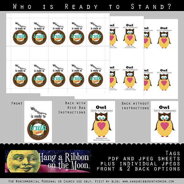 • Owl Tags: Finally, I’ve made some tags we’re going to pin to our owls. On the front is my Stand for Truth and Righteousness logo and on the back are the words “Owl Stand for Truth and Righteousness” (owl=I’ll, cute, huh?) and heating instructions for the rice bags. Again, these tags are available in pdf and jpeg files and with and without heating instructions.