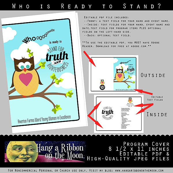 1. I absolutely loved your ideas. You have amazing talents that I would love to borrow for our 2013 New Beginnings program. We just finished our YWIE and I would also love to use your owl theme for this next year. Could you change the wording to Who is Ready to Stand in Holy Places? How would I contact you about an edit for this next years theme? Please advise 🙂