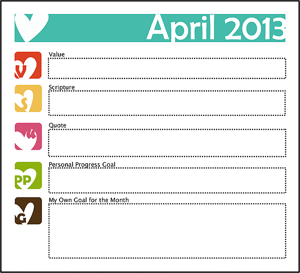 You can easily customize the monthly goal pages to fit your ward or stake’s monthly themes. Simply open up the interactive pdf file in Adobe Reader and enter a Personal Progress value, scripture, quote and Personal Progress goal on each month’s goal page. If you don’t have Adobe Reader, you can download it for free from adobe.com here. (I recommend you UNCHECK the box to install McAfee Security Plus BEFORE downloading Adobe Reader.)