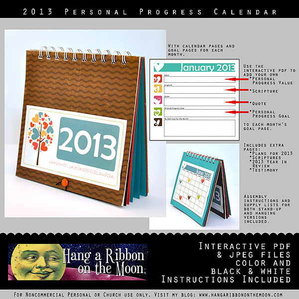 A 2013 Personal Progress calendar makes a great Christmas gift or New Beginnings handout for your girls! Or, you can do like we did last year in our ward and have the girls assemble their own calendars at a Personal Progress activity. I bound them ahead of time so all the girls had to do was cut out and glue on their pages.