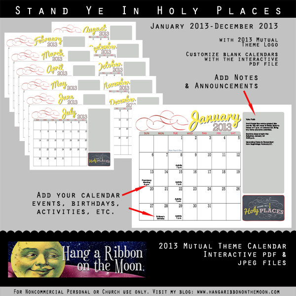 As requested, I’ve made a 2013 Young Women/Young Men Mutual Theme calendar for you. Featuring calendar pages for January 2013 through December 2013, each month includes this year’s Mutual theme and a sidebar space for you to add notes and additional information. Plus, I’ve added a special bonus for you: I’ve improved this calendar from last year’s version by taking a bit of extra time to make it easy for you to edit!