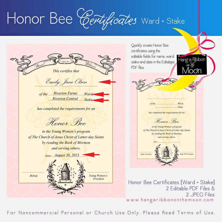 YW Honor Bee Certificate. Free downlad from Hang a Ribbon on the Moon. Editable/saveable PDF and high-quality JPEG file included!