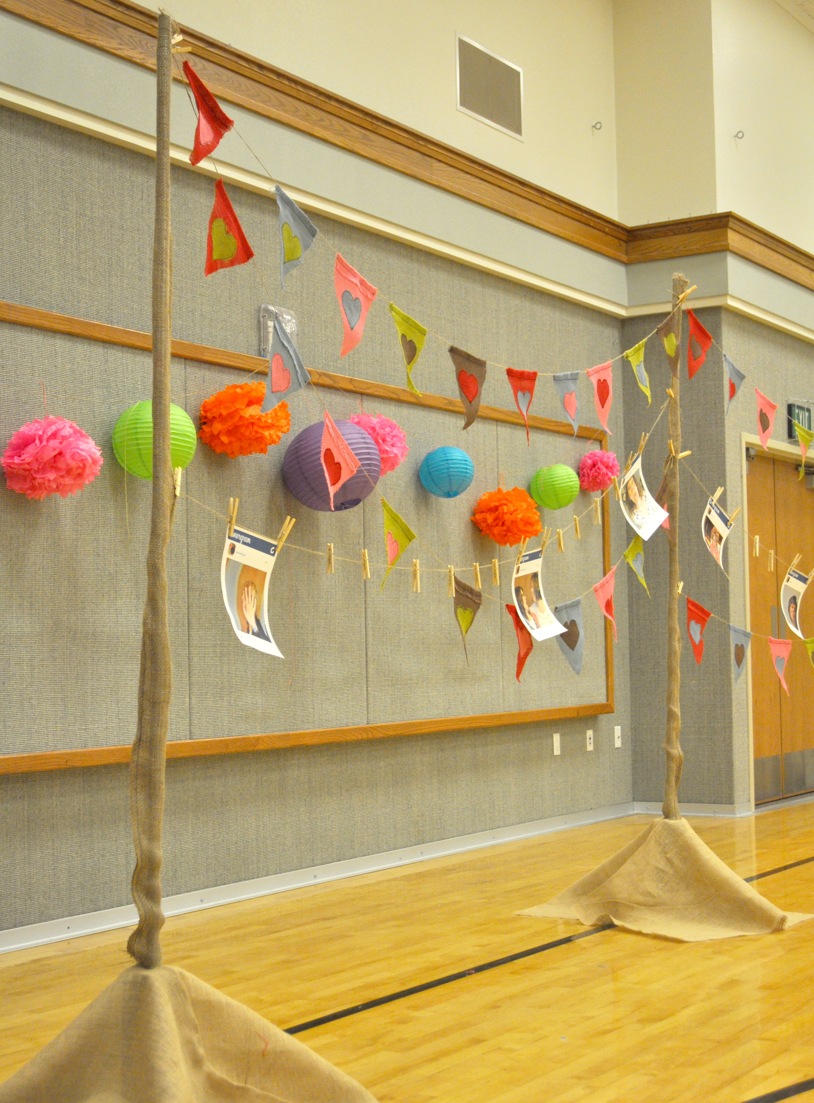 For the bunting, I made my own pattern and sewed 60 flags which I attached to some twine. [Download my pattern and detailed instructions below.] My husband made some tall burlap-covered poles with stands. By stringing the bunting between the poles and hanging tissue-paper pom-poms on the wall, we created a cheerful backdrop for our event. Additional bunting flags were hung on burlap-covered tables, the podium and the piano. We used safety pins to pin the bunting to the burlap and then clipped a clothespin over the safety pin.