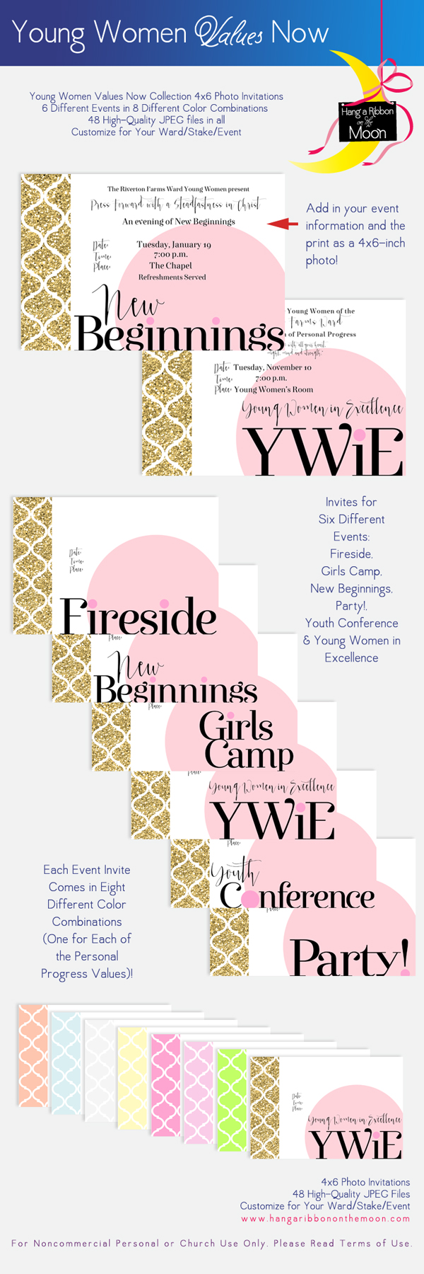 Plus, each type of invite comes in 8 different color versions (one for each of the YW Personal Progress Values) for a total of 48 high-quality JPEG files.YW Values Now Collection: 4x6 Photo Invitations