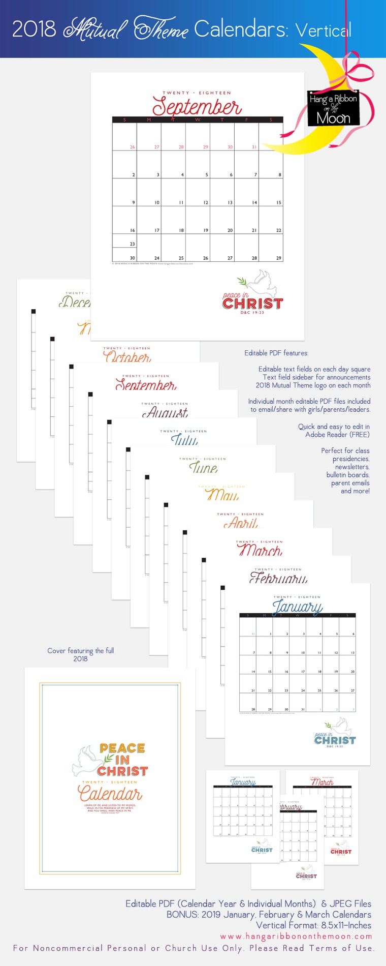 I’ve created these calendars as editable PDF files and included JPEGS in the download as well. Each calendar features a “Peace in Christ” logo. Plus, as a BONUS, I’ve included January, February and March of 2019 calendar pages!