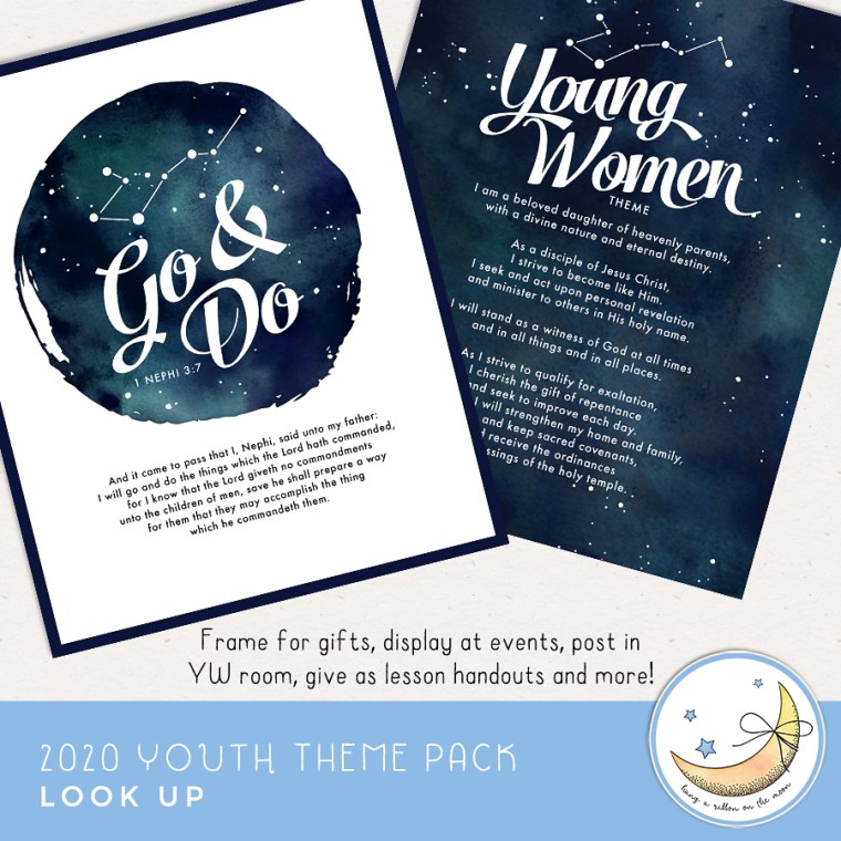 Encourage your youth to look up to God as they follow Nephi’s direction to go and do (1 Nephi 3:7). These ready-to-print posters feature a beautiful watercolor depiction of the night sky as well as the 2020 LDS Youth Theme full scripture. BONUS: Included in this download are coordinating posters of the NEW YW theme and a piece of Go & Do clipart.