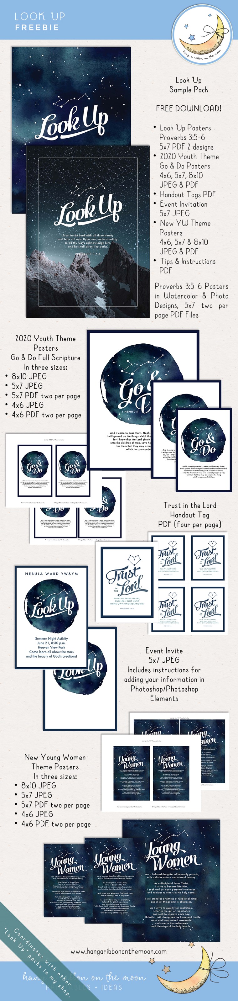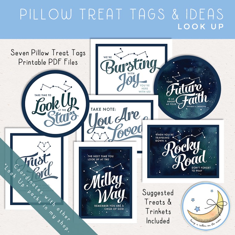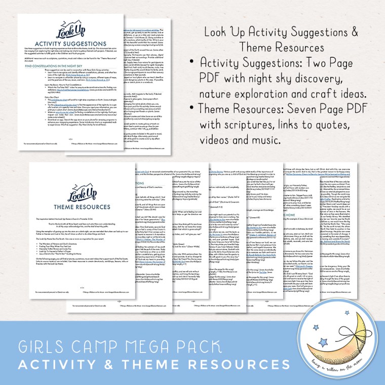 You’ll find three different “Look Up” themed girls pack camps in my Etsy shop: A Look Up Girls Camp Mega Pack, a Look Up Girls Camp Mini Pack, and a Look Up Pillow Treat Tags Pack.