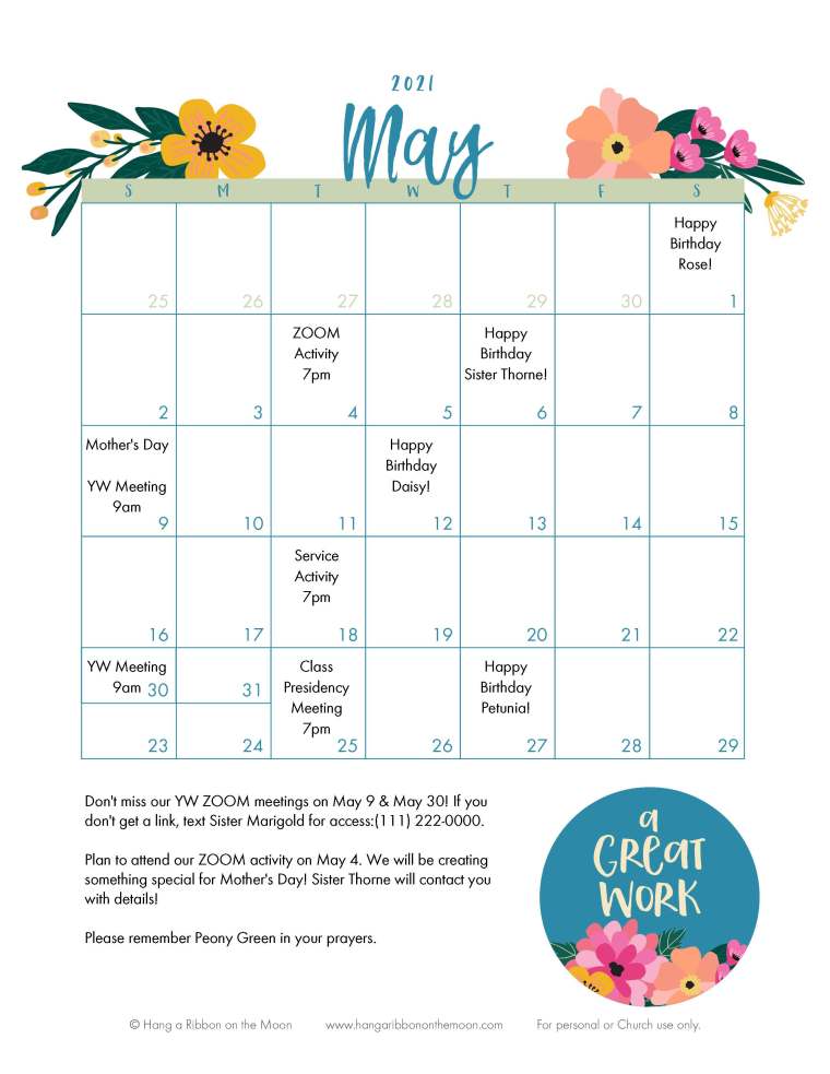 (You MAY print out/copy paper copies of these calendars to give out. You CAN share the PDF/Edited JPEG files electronically with those you serve in your callings. You MAY not share the electronic files with anyone else.)