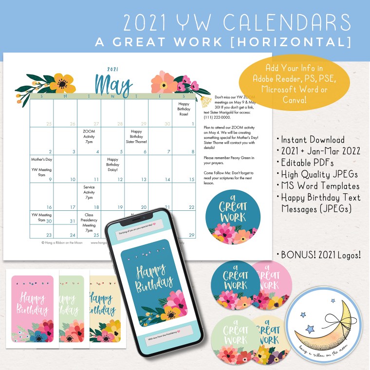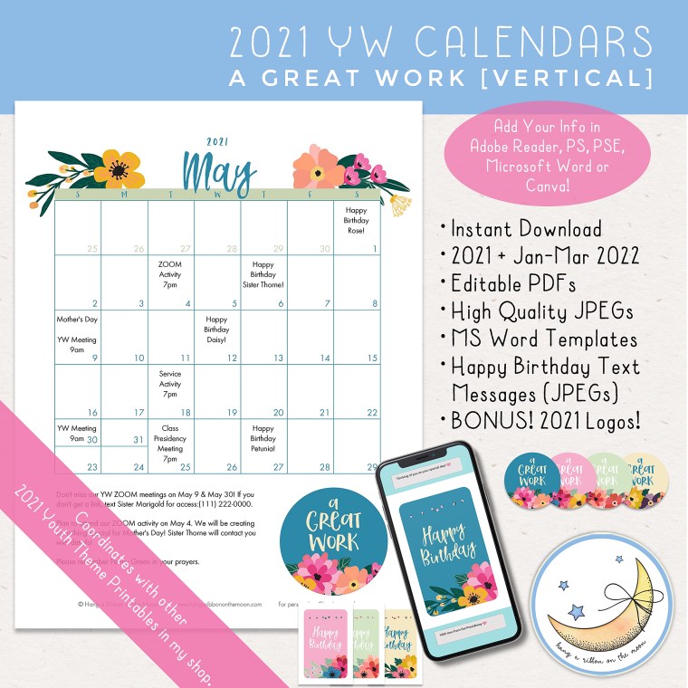 NOTE: For those of you who like Microsoft Word templates, you can find these calendars as Word Templates for sale in my Etsy shop in both horizontal and vertical formats. Editable PDF and JPEG versions included, as well as instructions for using all three types of files. Included with purchase are coordinating Happy Birthday text messages and BONUS 2021 Youth Theme logos.