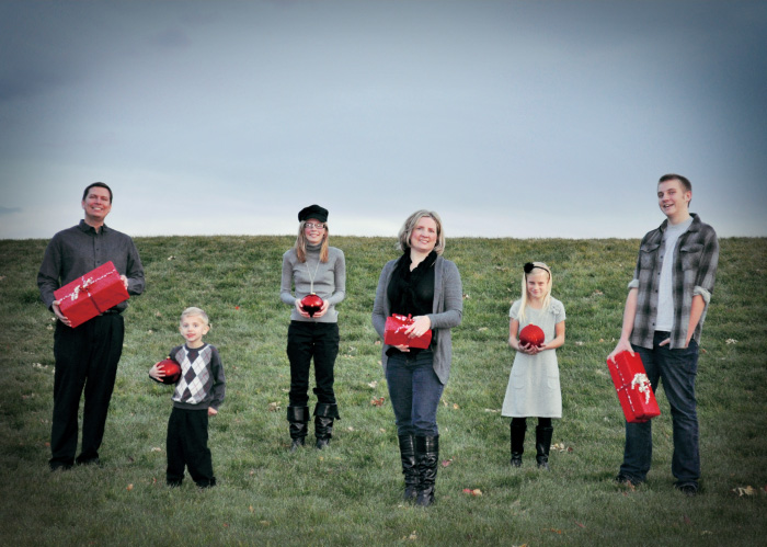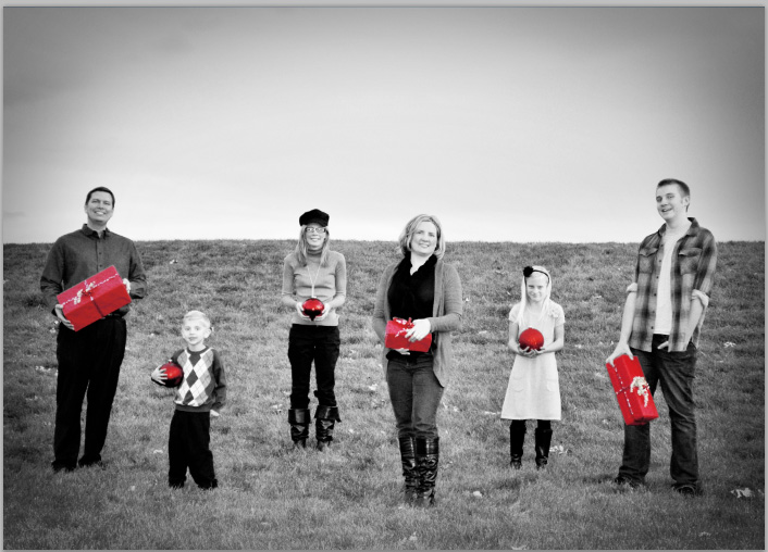 I hope you had a chance to look at Miss B’s tutorials in the December DST Insider!  She has a super-fast way to extract objects from photos using the Quick Selection tool in Photoshop/Photoshop Elements.  While she used her technique to combine parts of two photos into one, I’m going to show you how to use the same technique to create a Christmas card photo  with selectively colored elements like this one I used to design our 2011 family card: