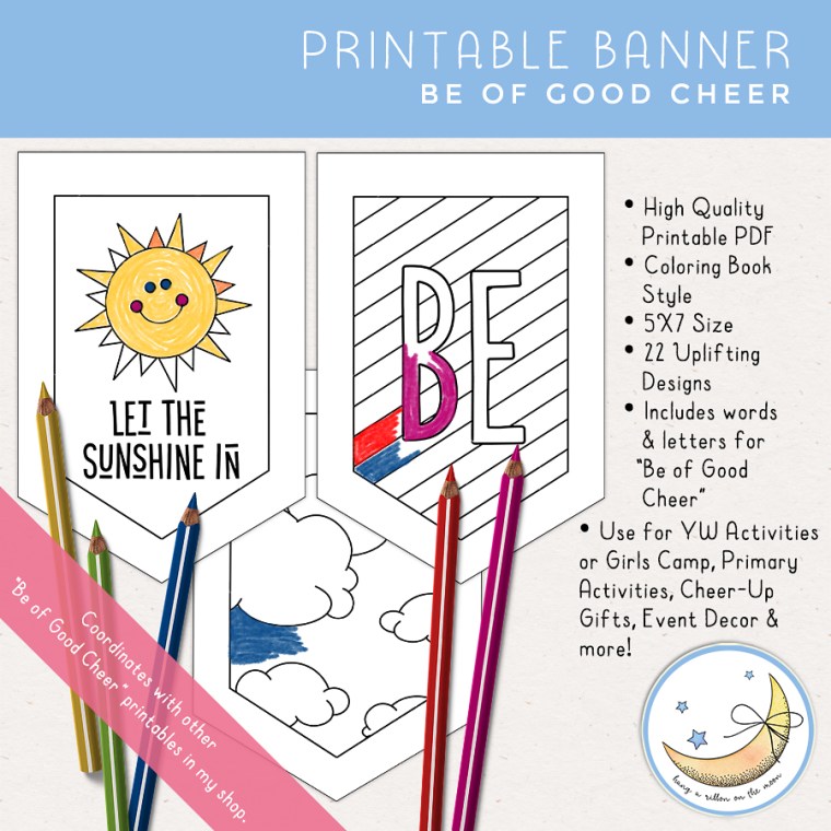 Need a way to cheer up a friend or family member? Looking for a way to help your children serve during the current crisis? Today, I’m giving away a fun project you can use to accomplish both tasks: a coloring-book style “Be of Good Cheer” banner.