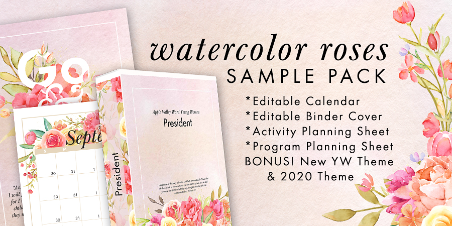 Along with my editable calendar, this sample download from my watercolor roses collection includes coordinating editable binder covers, an editable activity planning page, an editable program planning page AND bonus 5×7 prints of the NEW YW theme and the 2020 Youth Theme (Go & Do 1:Nephi 3:7)! [Scroll to the bottom of this post for the download link.]